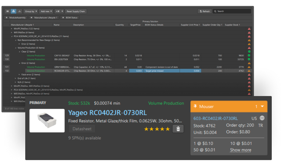 Przegląd kosztów oraz dostępność komponentów BOM w jednym miejscu. Altium Designer łączy się z setkami globalnych dostawców dzięki danym z Octopart i IHS Markit, zapewniając zawsze aktualne informacje o cenach, dostępności i cyklu życia komponentów.