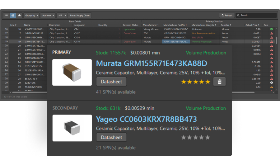 Alternatywne komponenty w ActiveBOM pozwalają zachowaj ciągłość projektu. Możliwość zastąpienia komponentów na schemacie alternatywnymi wyborami za pomocą jednego kliknięcia.