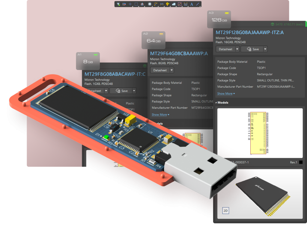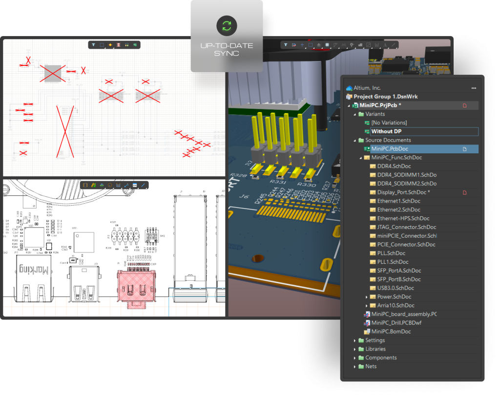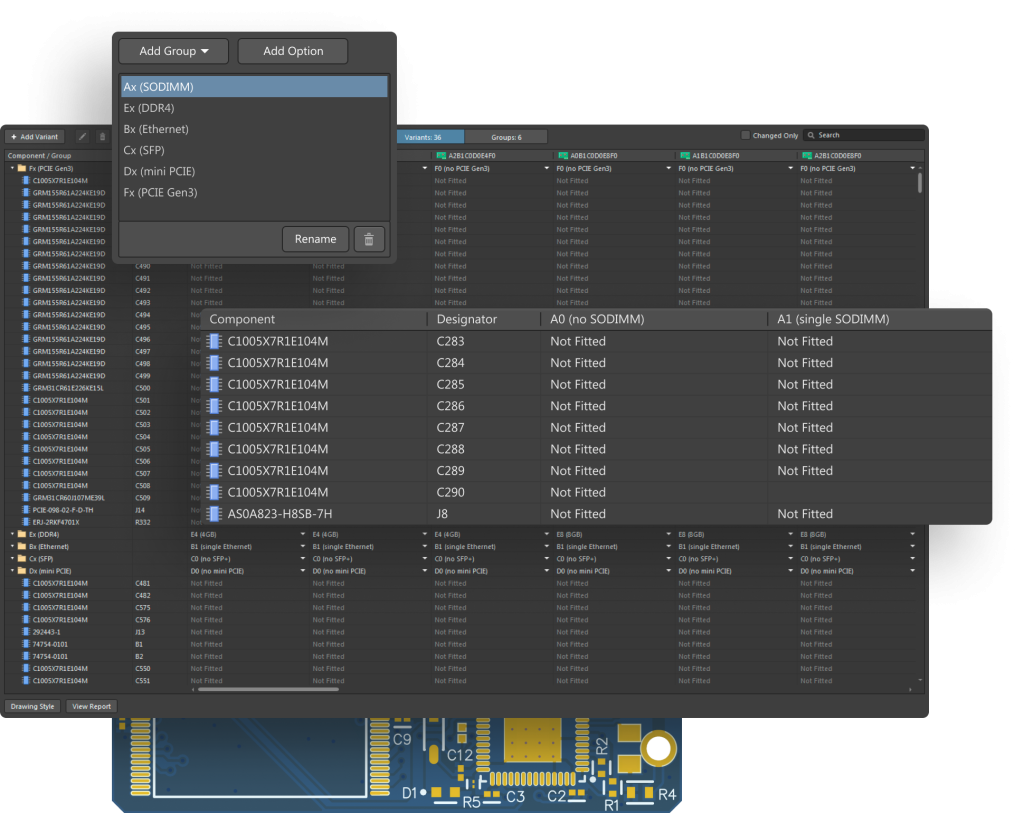 Warianty projektowe pozostają aktualne i zsynchronizowane na każdym etapie procesu projektowego — od schematów i PCB, przez zestawienia materiałowe (BOM), dokumenty Draftsman, aż po dokumentację wyjściową. Przejrzysta prezentacja wariantów na każdym etapie projektowania ułatwia zrozumienie składu każdego produktu.