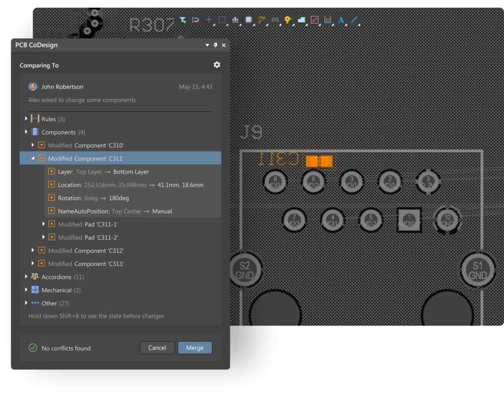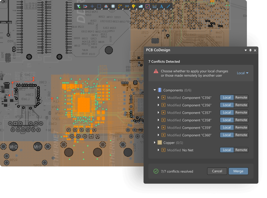 PCB CoDesign umożliwia szybkie i proste rozwiązywanie konfliktów. Gdy zmiany się pokrywają, użytkownik może zdecydować czy zachować zmiany lokalne, czy przyjąć najnowszą wersję z serwera. Dzięki temu potencjalne konflikty są rozwiązywane natychmiast, co pozwala zaoszczędzić wiele dodatkowej pracy.